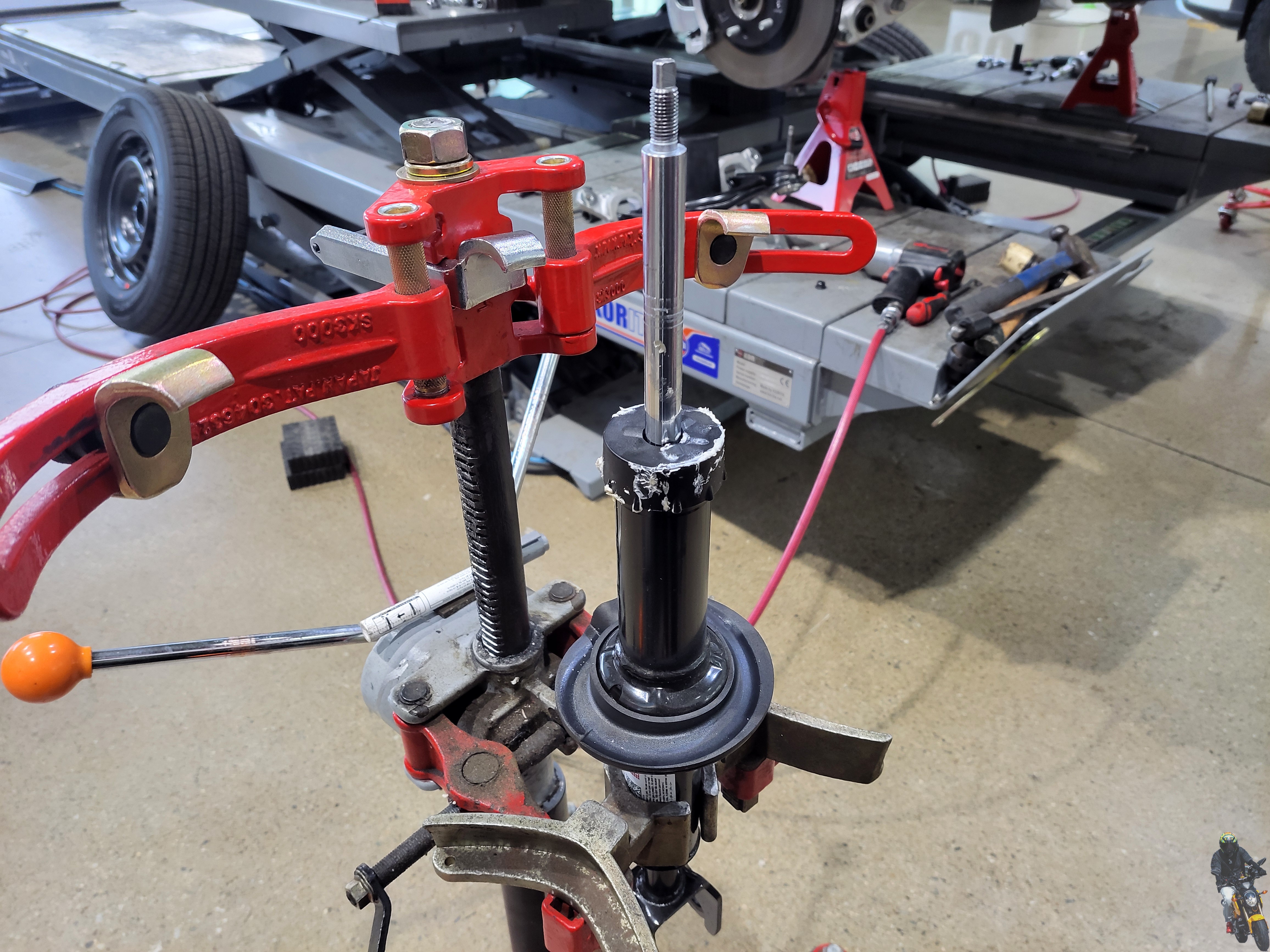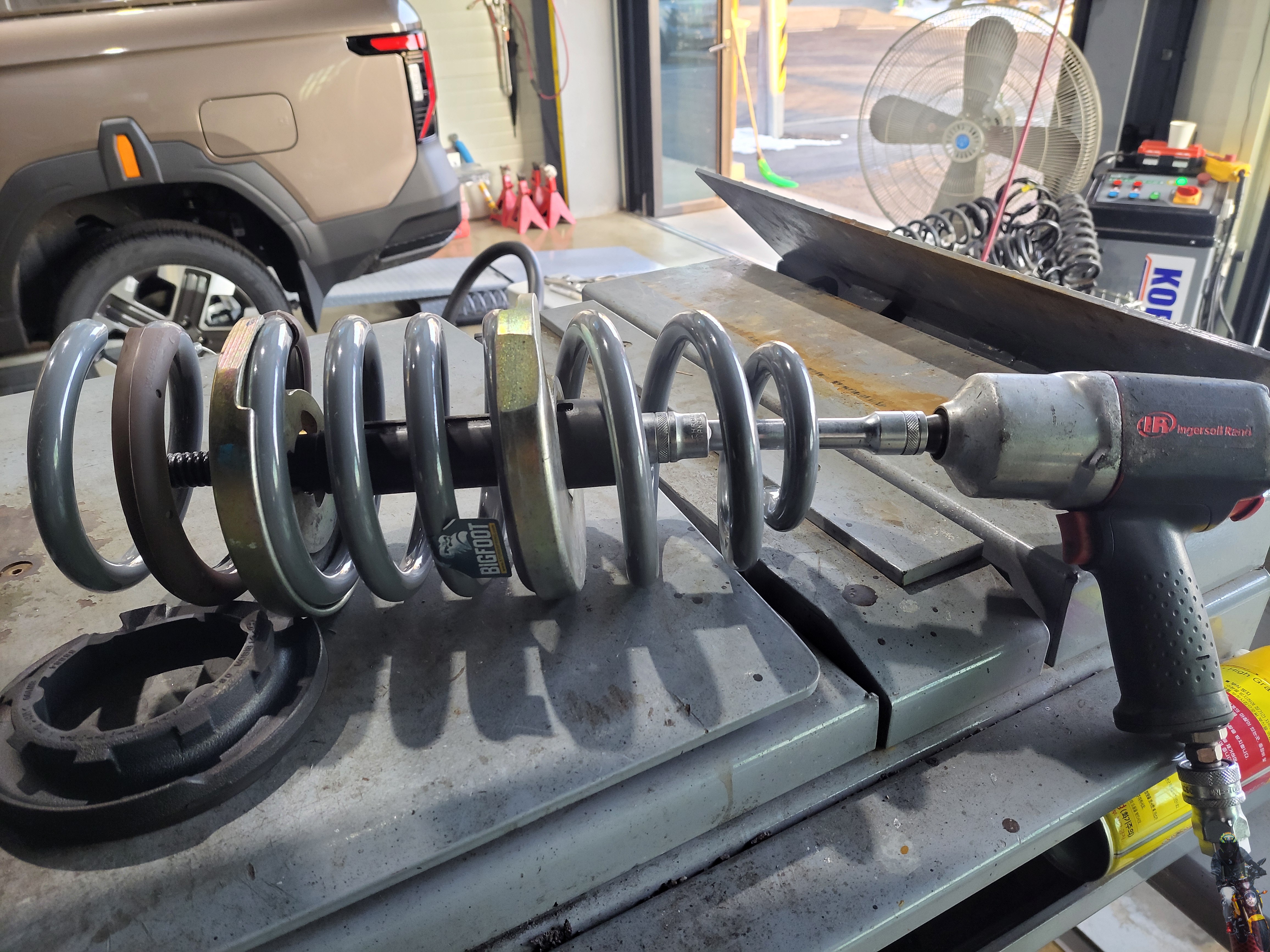 탈거한 순정쇼바스프링을 스프링 압축기에 고정을 하였습니다
