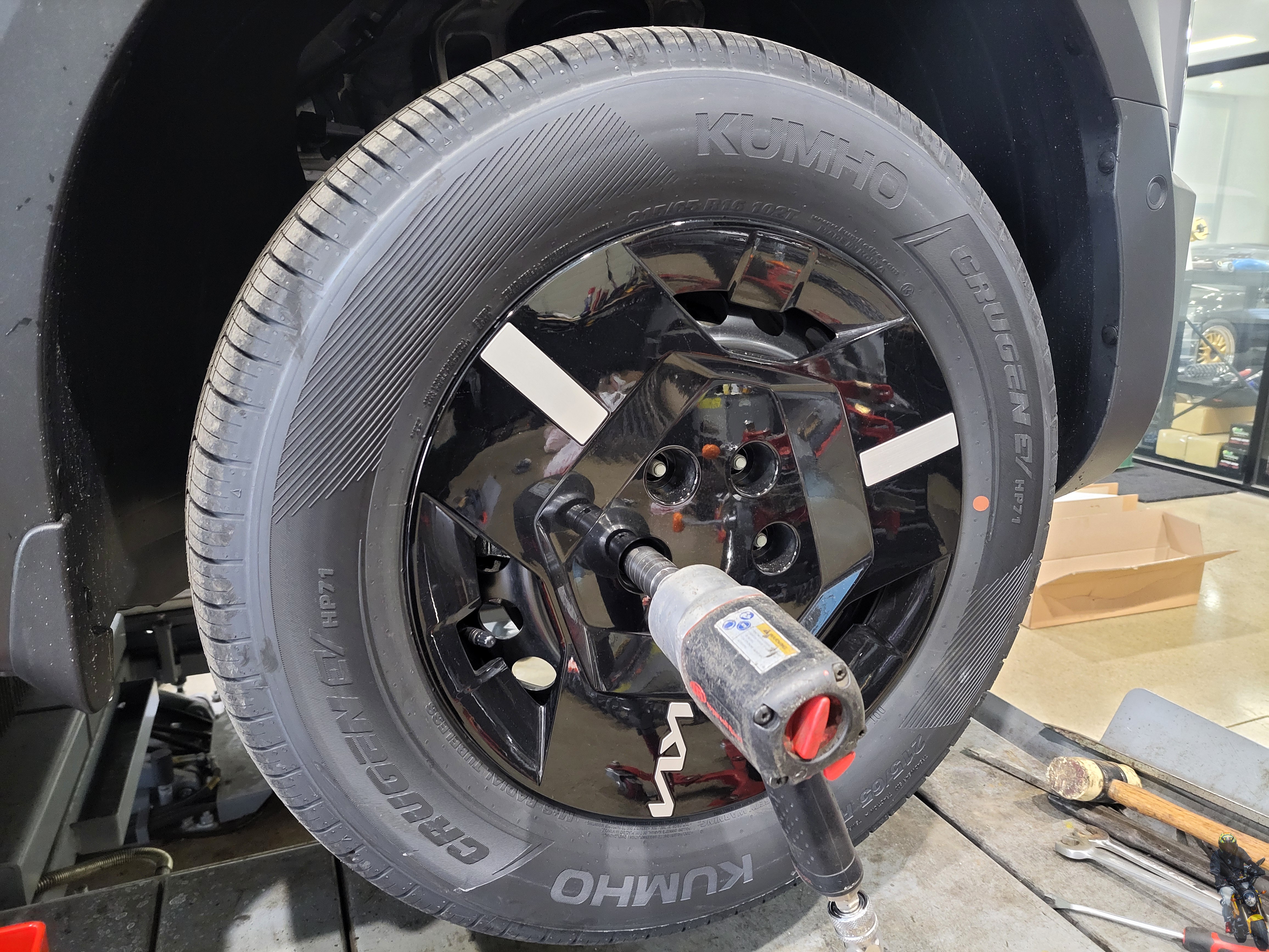 위해 휠타이어를 탈거하고 있습니다