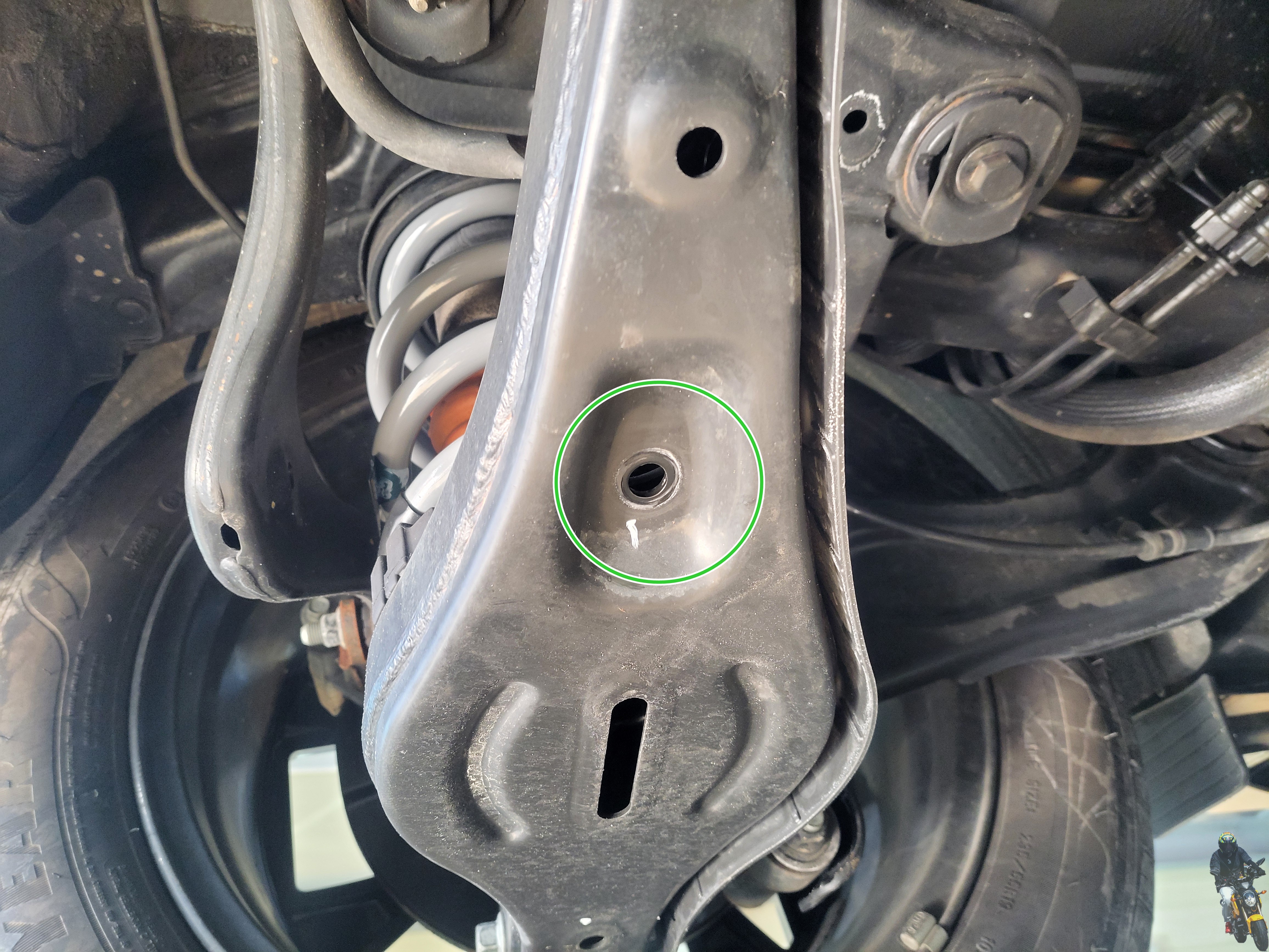 로우암과 너클의 홀을 잘 맞추고 볼트너트를 체결하고 있습니다