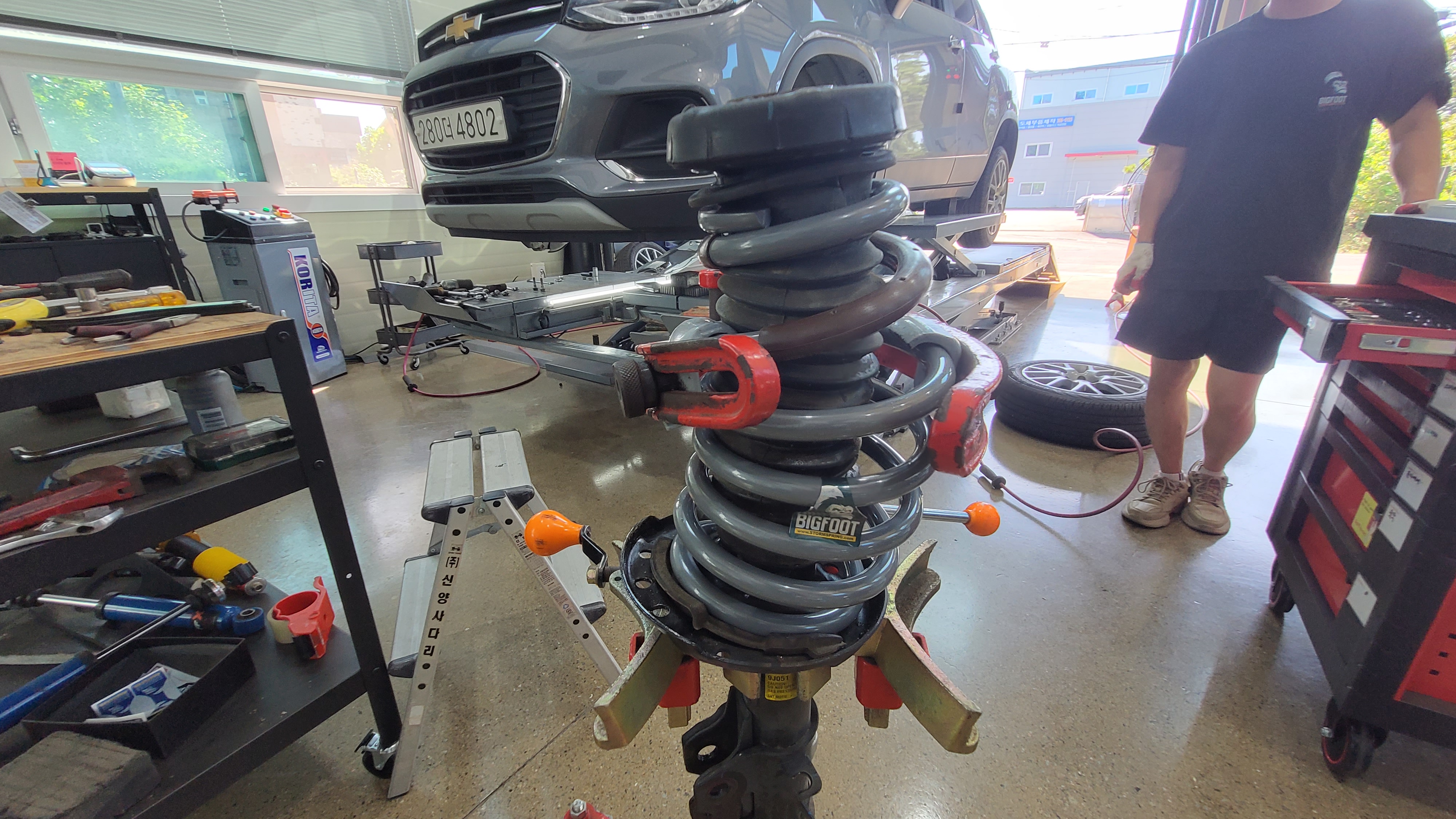 쉐보레 트랙스 차량의 전륜 쇼바스프링 먼저 작업을 하겠습니다