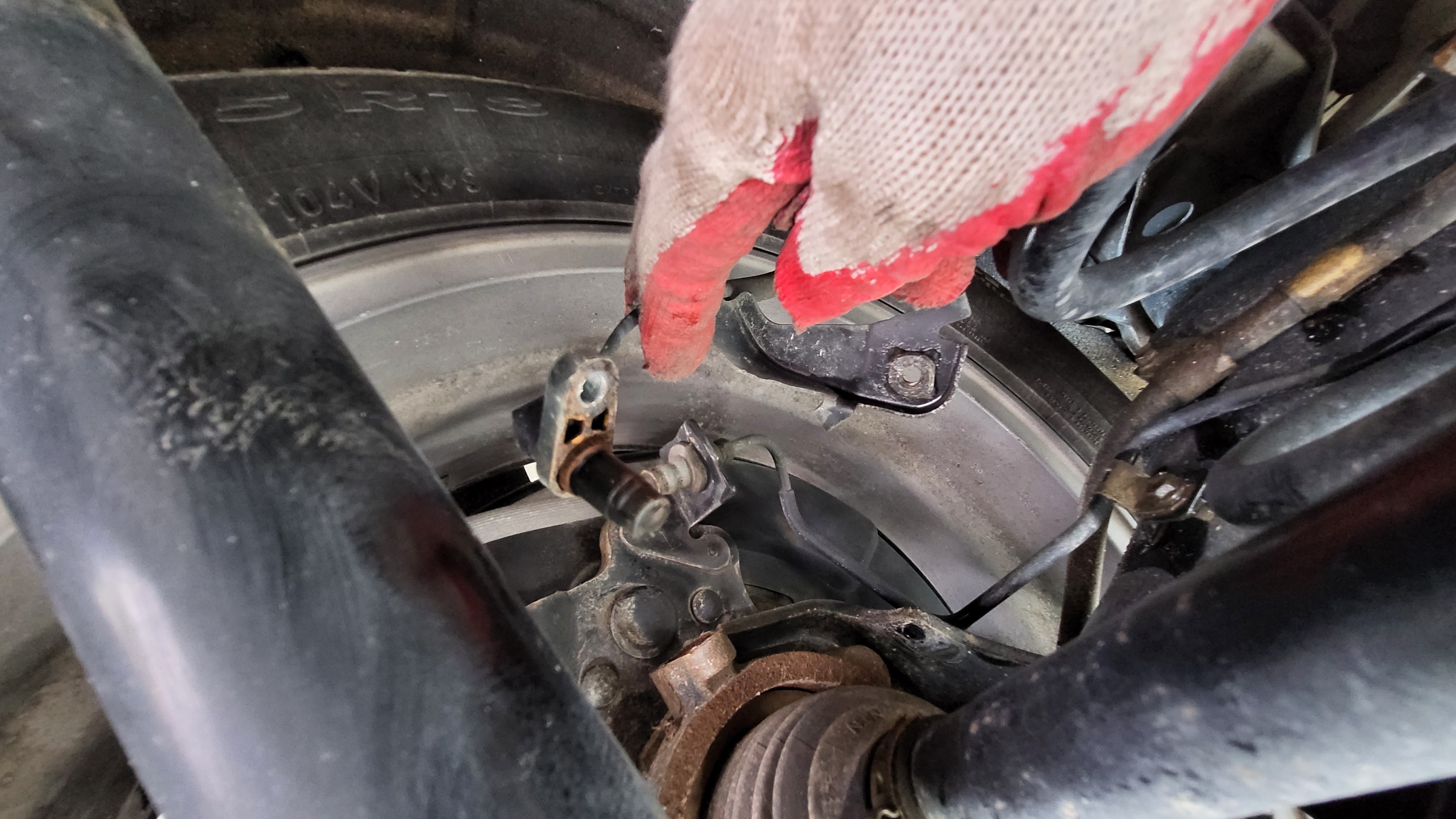주의할 점이 있습니다 차량의 바퀴가 지면에서 떨어지게 리프트로 띄우다 보면 휠 스피드센서가 당겨져 끊어질 수 있습니다 그러므로 휠스피드센서를 탈거해서 작업합니다